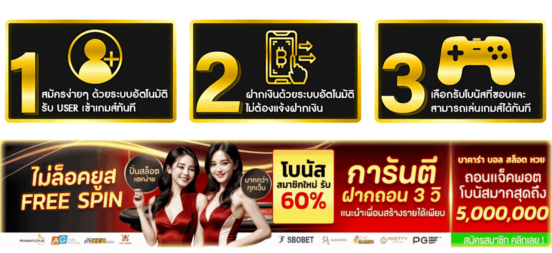ตอบ : มีโบนัสต้อนรับสมาชิกใหม่ 100% โปรโมชั่นคืนยอดเสีย เครดิตฟรี และกิจกรรมแจกรางวัลประจำเดือน สามารถรับได้ทุกวันไม่มีเงื่อนไขผูกมัด